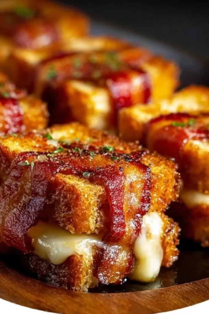 These bacon-wrapped grilled cheese fingers take the nostalgia of a grilled cheese sandwich and turn it into an irresistible finger food. Each piece starts with a slice of bread topped with cheese, then wrapped in a strip of bacon and grilled until the bacon is crispy and the cheese is perfectly melted. They’re simple to prepare, offer great texture contrast, and pair well with a variety of dips and sides.
