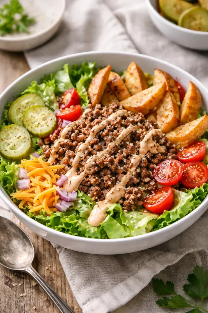 - Build the bowls: In each bowl, make a bed of mixed greens. Spoon the cheesy beef mixture over the greens. Scatter cherry tomatoes, pickles, corn, and the reserved caramelized onions. Drizzle with the special sauce and finish with chopped parsley or chives.