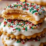 These festive little sandwiches combine salty Ritz crackers, gooey caramel, and white chocolate for a sweet-and-salty party snack that’s perfect for cookie exchanges or holiday platters. For a classic buttery cookie to serve alongside these bites, try the spritz Christmas cookies recipe for a contrasting texture and flavor.