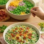 Light, bright, and ready in minutes, this salad relies on a few pantry staples and frozen peas for fast prep. The dressing of mayonnaise and sour cream keeps the texture smooth while apple cider vinegar adds brightness. It’s forgiving — you can adjust mayo or sour cream to suit your taste and swap bacon for a vegetarian bacon alternative if needed.