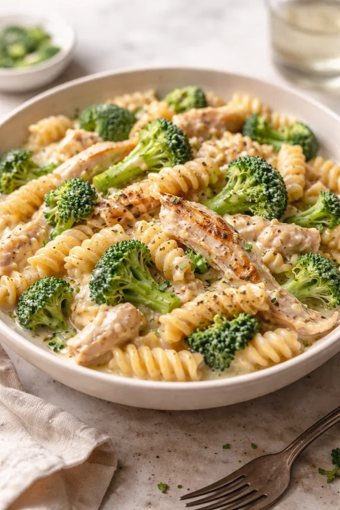 Bright broccoli, tender shredded rotisserie chicken, and a velvety Parmesan-mozzarella sauce coat penne pasta in this one-skillet style supper. The recipe leans on a little reserved pasta water and a finishing knob of cold butter to create a glossy, restaurant-quality sauce. It’s forgiving, flexible, and perfect for using up leftover chicken.