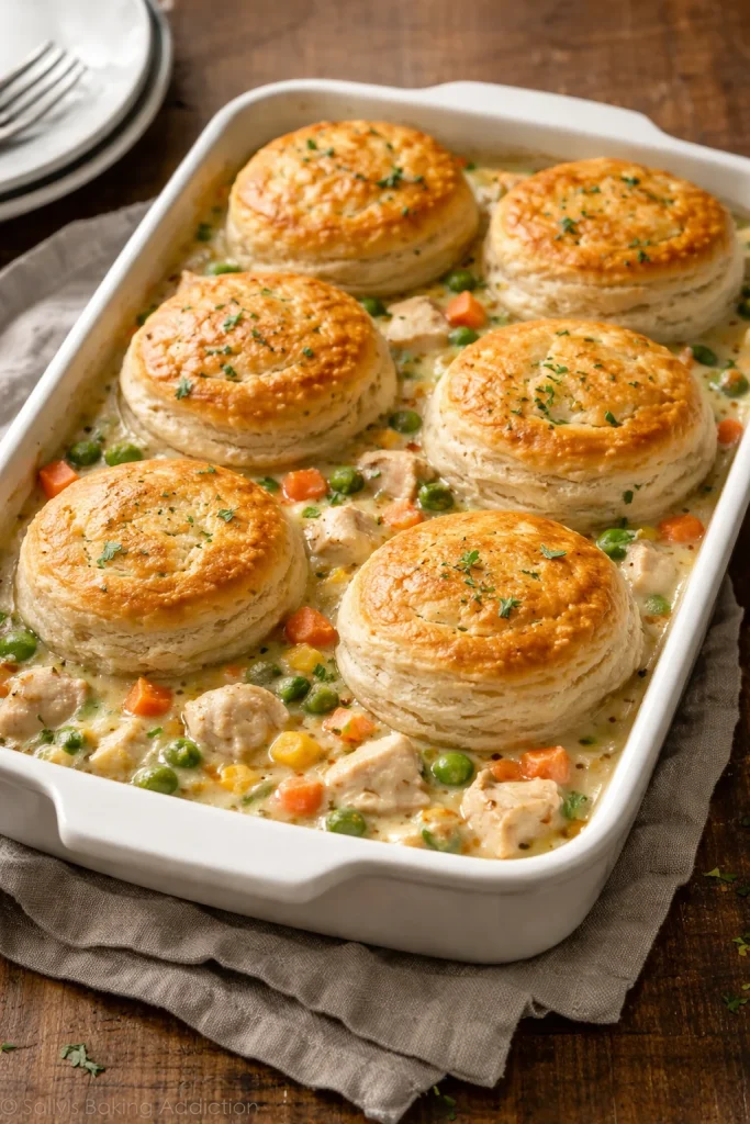 Start by mixing the cooked chicken, mixed vegetables, creamy sauce, chicken broth, and seasonings until everything is evenly coated. Press one pie crust (or arrange biscuits) into a baking dish as the base, pour in the filling, then cover with the second crust (or more biscuits). Cut vents in the top crust to let steam escape and bake until the crust is golden and the filling is bubbling. Let it rest briefly so the filling sets for clean slices.