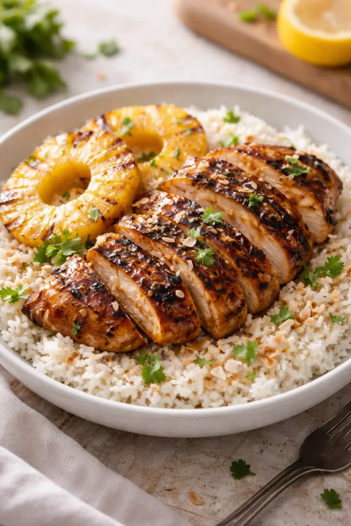 When you plate this Hawaiian Chicken, Pineapple and Coconut Rice, you’re not just serving a meal — you’re offering a small island escape filled with warm aromas, bright citrus notes, and the comforting hug of coconut rice. It’s a homemade meal that feels both indulgent and wholesome, perfect for weeknights, family dinners, or turning an ordinary evening into a little celebration. If you want another quick take on pineapple chicken that pairs perfectly with coconut rice, I love Half Baked Harvest’s 30 Minute Pineapple Chicken with Coconut Rice for an inspiring, speedy variation. Invite someone you love, set a casual table, and let the kitchen fill with the joyful scents of this tropical comfort food.