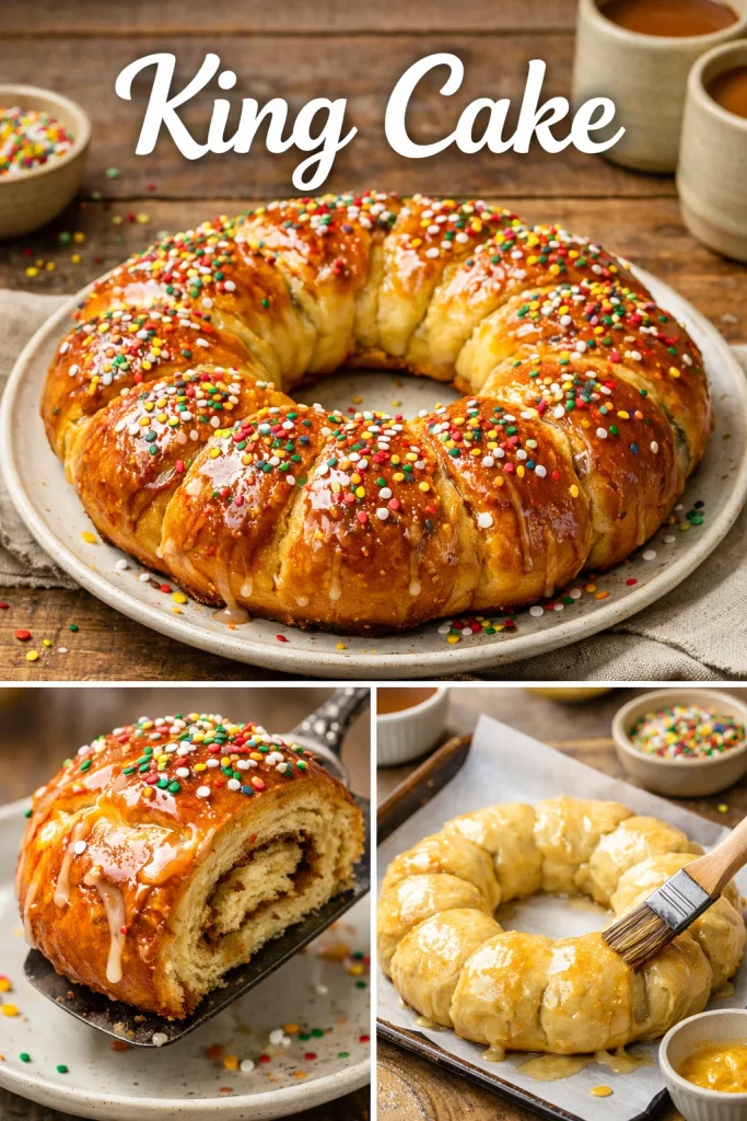 There is a special warmth that comes from kneading dough, sharing stories while it rises, and cutting into a glossy King Cake with loved ones. This recipe bridges homemade meal comfort and a festive treat all in one — convertible to a healthy option or an indulgent dessert depending on the day. Whether you are celebrating a holiday, hosting a casual get-together, or simply seeking a sweet ritual to make any morning feel like a small festival, this King Cake invites you to bake, share, and savor. For more history about this lovely tradition, see King cake – Wikipedia.