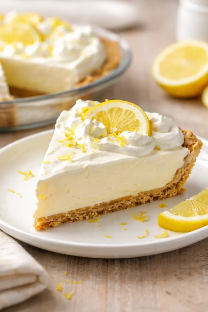 Serve slices on simple white plates to spotlight the pie’s pale lemon hue. Pair with a cup of tea or sparkling lemonade and let the contrast of hot and cold create a cozy rhythm. For a festive touch, top each slice with a mint sprig and a dusting of powdered sugar. This pie is lovely after a light summer dinner, at a bridal shower, or tucked into a family picnic — it tastes like sunshine and conversation.