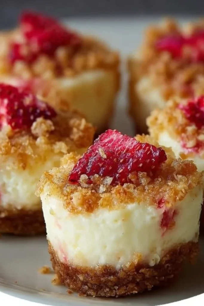 This recipe is built in three main stages: prepare the crust, whip the filling, and chill until set. Press the crumb mixture into molds, fill with the cream cheese mixture, chill for at least 2 hours, then top with fresh strawberries just before serving. Use a small spoon or piping bag for neat portions and press firmly when forming the crust so the bites hold together when removed from the molds.