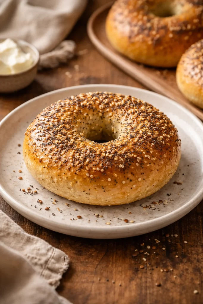 Present these bagels warm and inviting. For a casual family breakfast, slice and toast; offer spreads like herb cream cheese, peanut butter and banana, or smashed avocado and chili flakes. As a quick dinner idea, top with scrambled eggs, sautéed spinach, and smoked salmon for elegant comfort. For a festive treat, make a bagel board with sliced bagels, assorted cheeses, fruit, and preserves to share around the table. The aroma of fresh-baked bagels, the sound of laughter, and a plate of warm slices make any gathering feel like home.