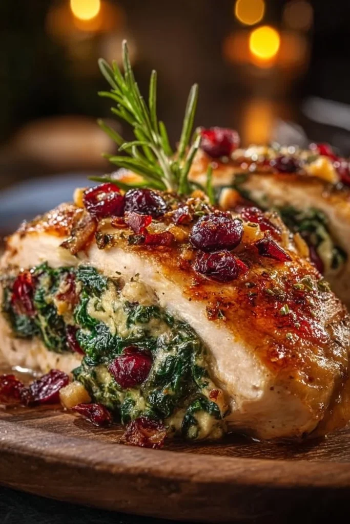 This recipe combines tender chicken breasts stuffed with a creamy mixture of spinach, dried cranberries, and cream cheese, lightly seasoned and finished with a golden sear and oven bake. The cranberries add bright sweetness that contrasts nicely with the savory cheese and spinach, while the breadcrumb coating gives a pleasant crunch.
